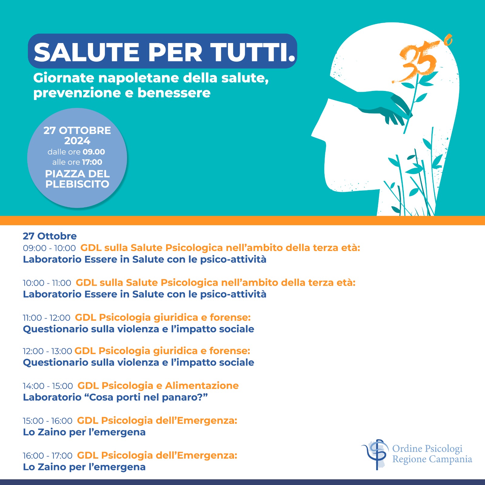 Nell’ambito del ciclo di eventi per il 35° anniversario della Legge 56/89 “Ordinamento della professione di psicologo”, per il terzo anno consecutivo, l’Ordine degli Psicologi della Campania parteciperà alle Giornate della Salute che si terranno il 26 e 27 ottobre 2024 in Piazza del Plebiscito, dalle ore 9:30 alle ore 18:00.