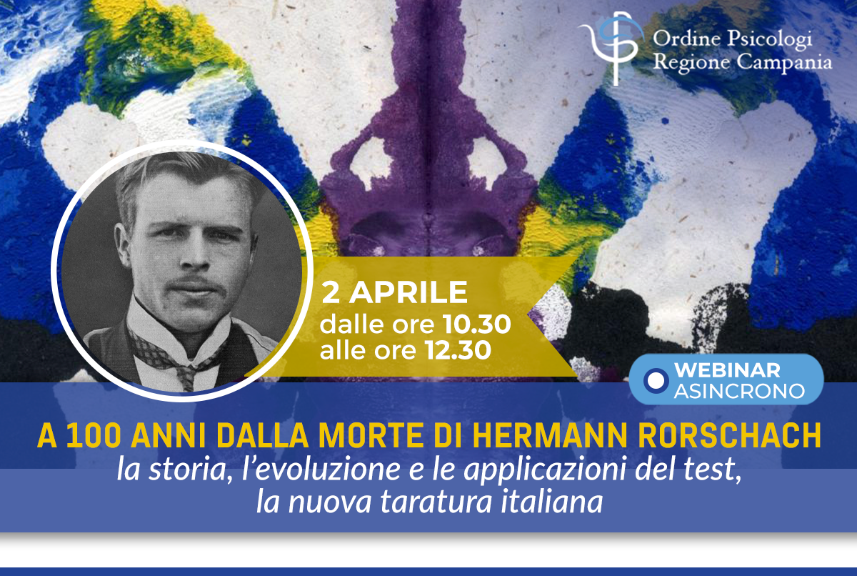 Il webinar, promosso dall’Ordine degli Psicologi Campania sarà svolto in occasione della ricorrenza del centenario della prematura morte di Hermann Rorschach (8 novembre 1884 – 2 aprile 1922), creatore del metodo psicodiagnostico più diffuso a livello mondiale, di cui si avvalgono migliaia di psicologi, confermando l’incredibile successo di questo strumento che, peraltro, vanta una innumerevole quantità di articoli scientifici.