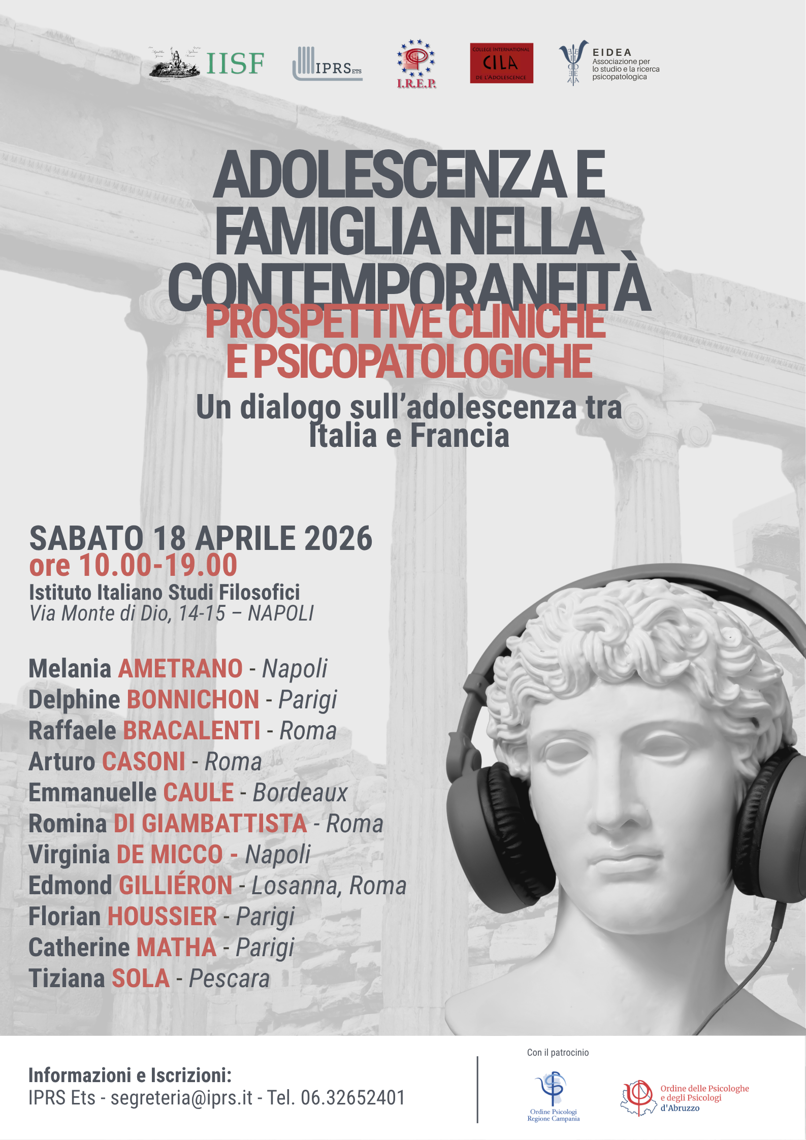 Sabato 18 aprile 2026, dalle ore 10.00 alle 19.00, si terrà presso l’Istituto Italiano di Studi Filosofici di Napoli (Via Monte di Dio, 14-15) il convegno “Adolescenza e famiglia nella contemporaneità. Prospettive cliniche e psicopatologiche”, promosso da IISF, IPRS Ets, I.R.E.P. e CILA in collaborazione con EIDEA – Associazione per lo studio e la ricerca psicopatologica, patrocinato dall’Ordine degli Psicologi della Regione Campania