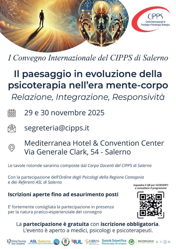 Il convegno: “Il paesaggio in evoluzione della psicoterapia nell’era mente-corpo. Relazione, integrazione e responsività”, promosso dal Centro Internazionale di Psicologia e Psicoterapia Strategica – CIPPS e patrocinato dall’Ordine Psicologi Regione Campania, si terrà i prossimi 29 e 30 novembre presso il Mediterranea Hotel & Convention Center di Salerno.