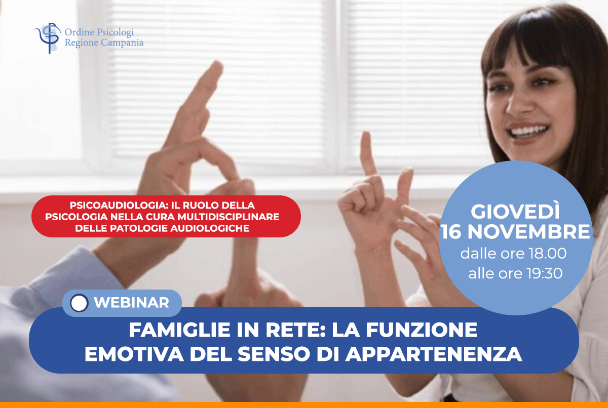 Il webinar, inserito nel ciclo “PSICOAUDIOLOGIA: IL RUOLO DELLA PSICOLOGIA NELLA CURA MULTIDISCIPLINARE DELLE PATOLOGIE AUDIOLOGICHE” è promosso dal gruppo di Lavoro sulla Psicoaudiologia dell’Ordine Psicologi Regione Campania.