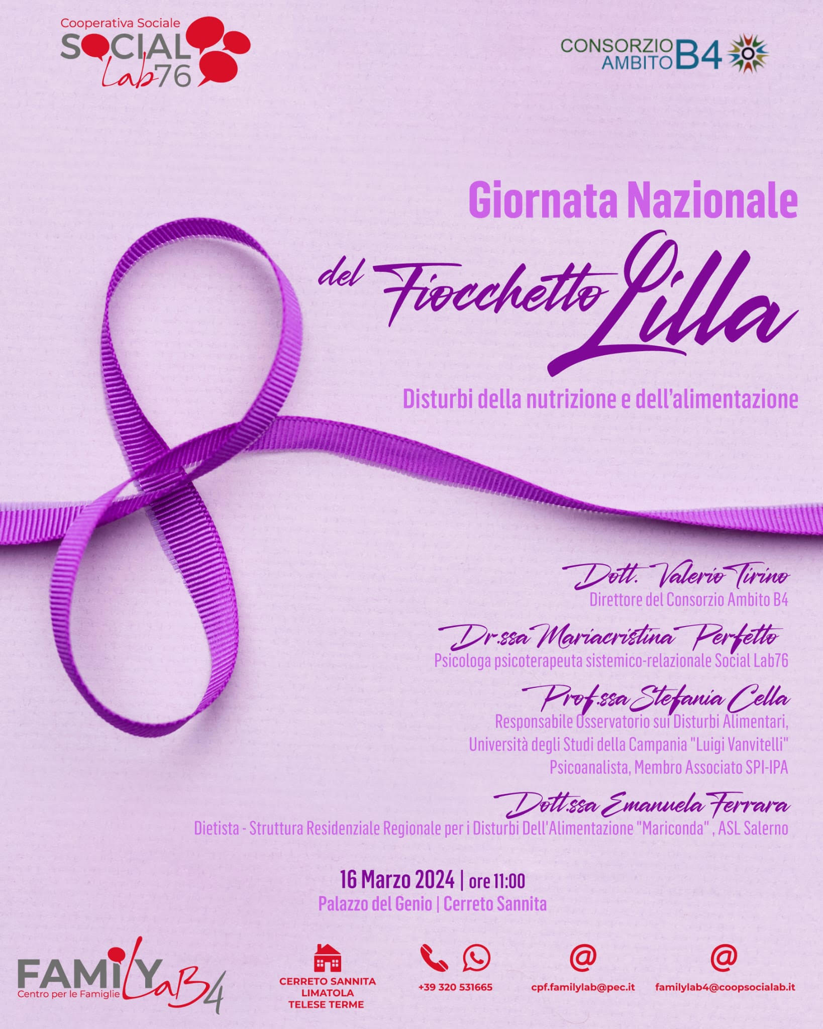 In occasione della Giornata Nazionale del Fiocchetto Lilla dedicata ai Disturbi della nutrizione e dell’alimentazione il Consorzio Ambito B04 in collaborazione con la Cooperativa Sociale Social Lab76 promuove un incontro pubblico il 16.03.2024 alle ore 11.00 presso il Palazzo del Genio di Cerreto Sannita.