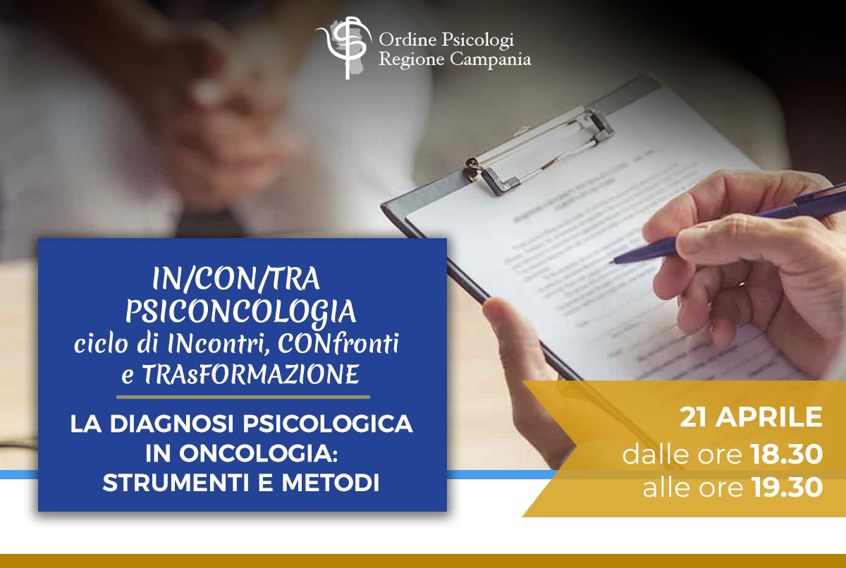Il webinar, inserito nell’ambito del ciclo di webinar IN/CON/TRA PSICONCOLOGIA: ciclo di INcontri, CONfronti e TRAsFORMAZIONE, è promosso dal gruppo di lavoro per la Psiconcologia dell’Ordine degli Psicologi della Regione Campania.