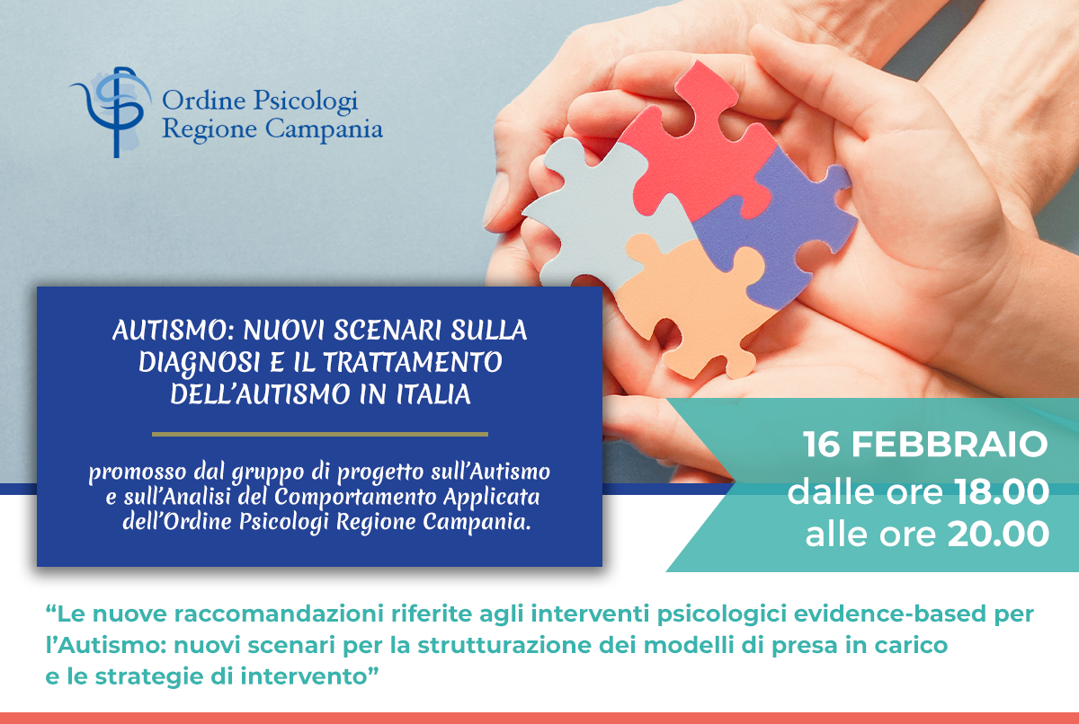 Il webinar, inserito nell’ambito del ciclo di webinar Autismo: Nuovi scenari sulla Diagnosi e il Trattamento dell’Autismo in Italia, è promosso dal gruppo di progetto sull’Autismo e sull’Analisi del Comportamento Applicata dell’Ordine Psicologi Regione Campania.