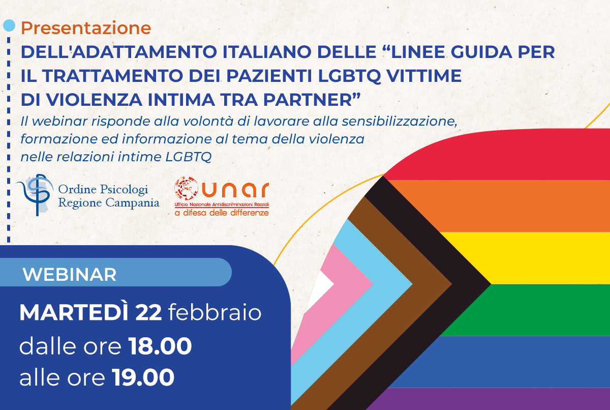Il webinar, promosso dal Comitato Pari Opportunità e Cura delle Relazioni (CPO&CR) dell’Ordine degli Psicologi Campania e patrocinato dall’UNAR – Ufficio Nazionale Antidiscriminazioni Razziali della Presidenza del Consiglio dei Ministri Dipartimento delle Pari Opportunità, ha la finalità di presentare l’adattamento italiano delle “LINEE GUIDA PER IL TRATTAMENTO DEI PAZIENTI LGBTQ VITTIME DI VIOLENZA INTIMA TRA PARTNER” redatte dall’American Psychiatric Association ed adattate al lettore italiano dal CPO&CR.