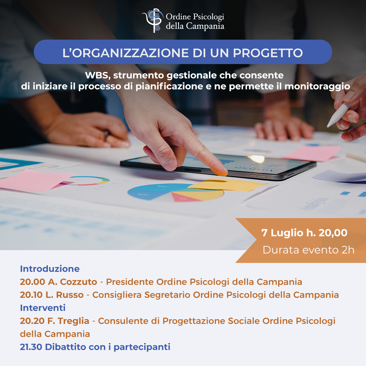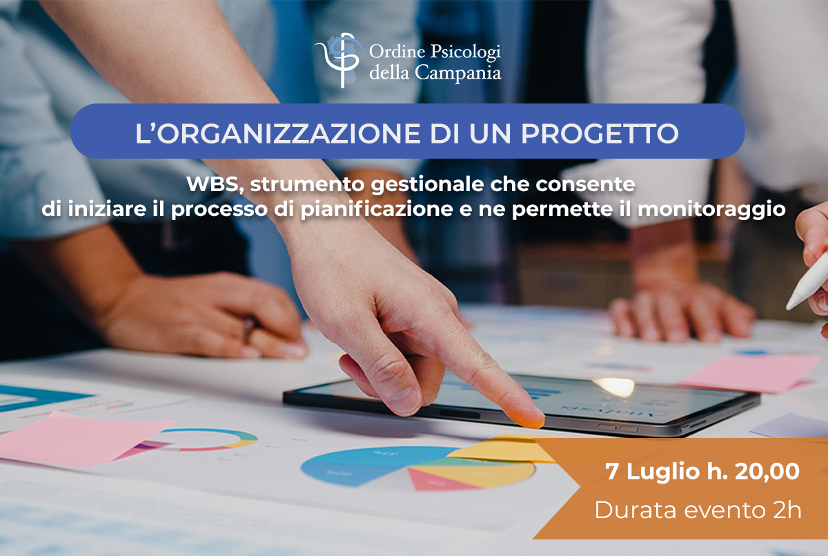 Il webinar, promosso dall’Ordine degli Psicologi della Regione Campania ha quale focus della formazione la WBS ovvero lo strumento gestionale che consente di iniziare il processo di pianificazione e ne permette il monitoraggio. La WBS permette attraverso la creazione di elementi di dettaglio (Work Package o WP) di definire ed assegnare le attività, definire i tempi e gestire i costi.