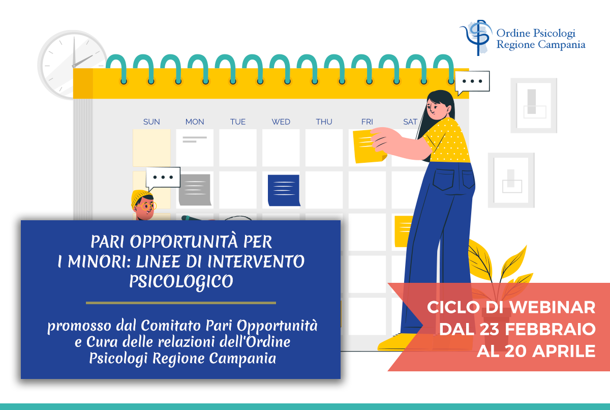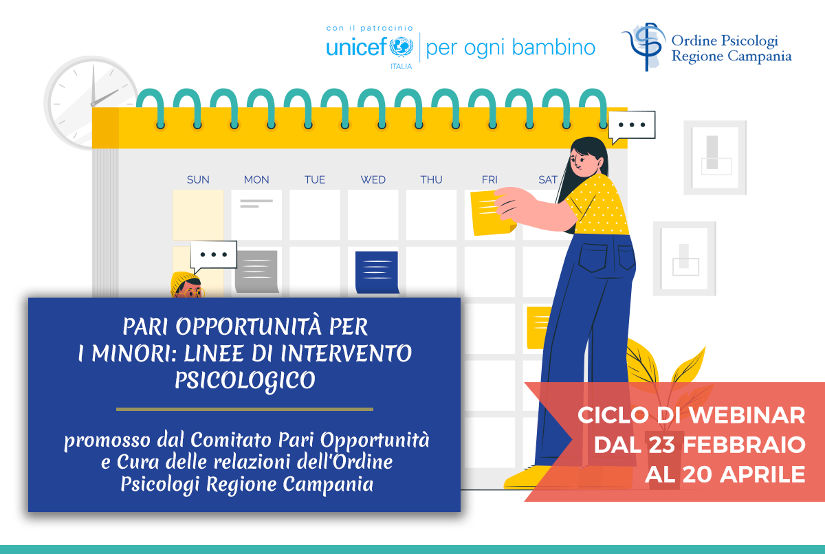 All’interno dell’ambito del Comitato Pari Opportunità e Cura delle relazioni dell’Ordine degli Psicologi della Campania, con il patrocinio di Unicef, si intende promuovere uno spazio di riflessione e confronto tra colleghi in merito all’Età Evolutiva. Il ciclo di webinar ha come obiettivo quello di porre l’attenzione su tematiche legate alle pari opportunità e lotta alle discriminazioni focalizzandoci su alcune tematiche, con la volontà di ampliare in futuro gli argomenti trattati, e sul ruolo e contributo della psicologia in merito ai diritti di salute psicologica dell’infanzia ed adolescenza. Sono presentati tre webinar che hanno un filo conduttore relativo alle pari opportunità in ambito psicologico legate all’infanzia ed adolescenza, affrontando temi legati all’ambito sociale in cui vivono i minori, per poi proseguire con tematiche legate alla cura e all’ambiente psicologico di riferimento.