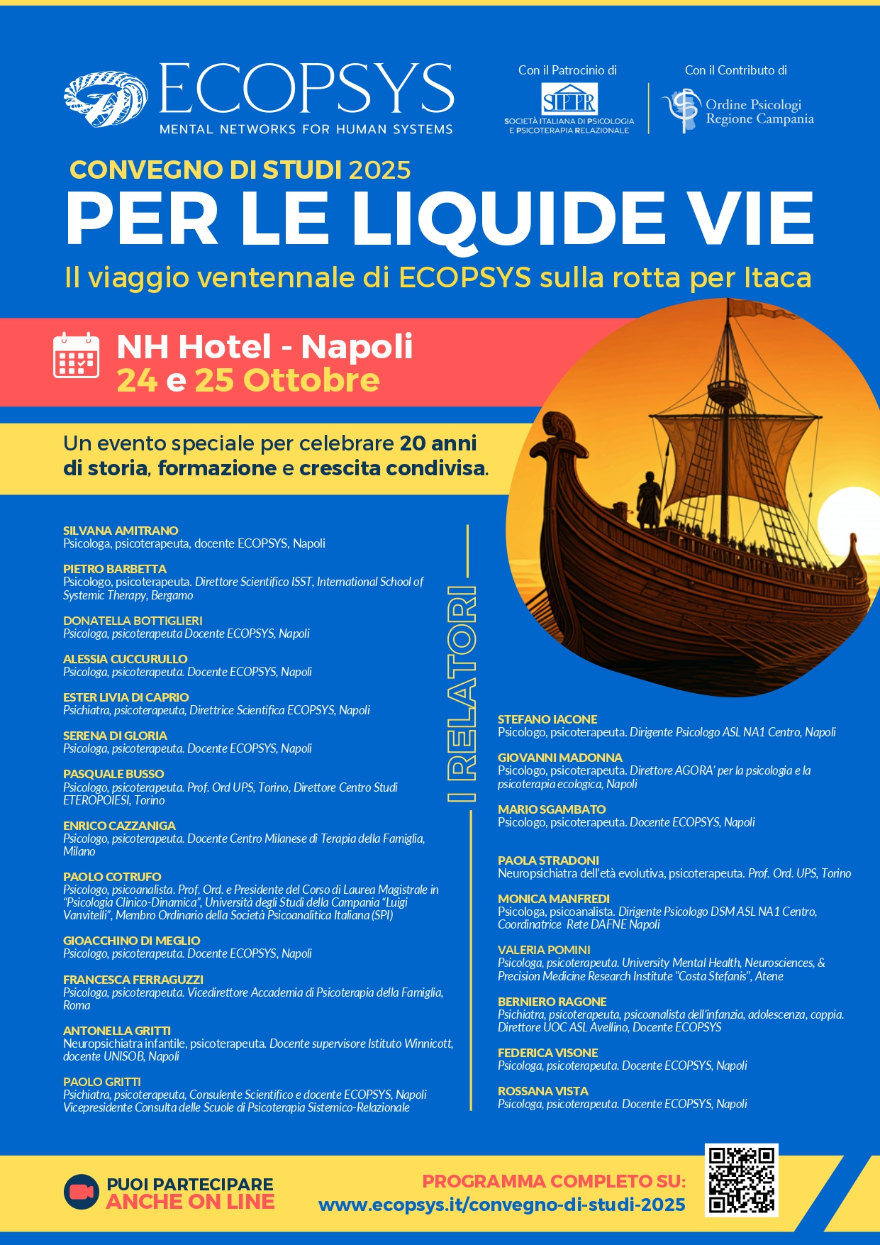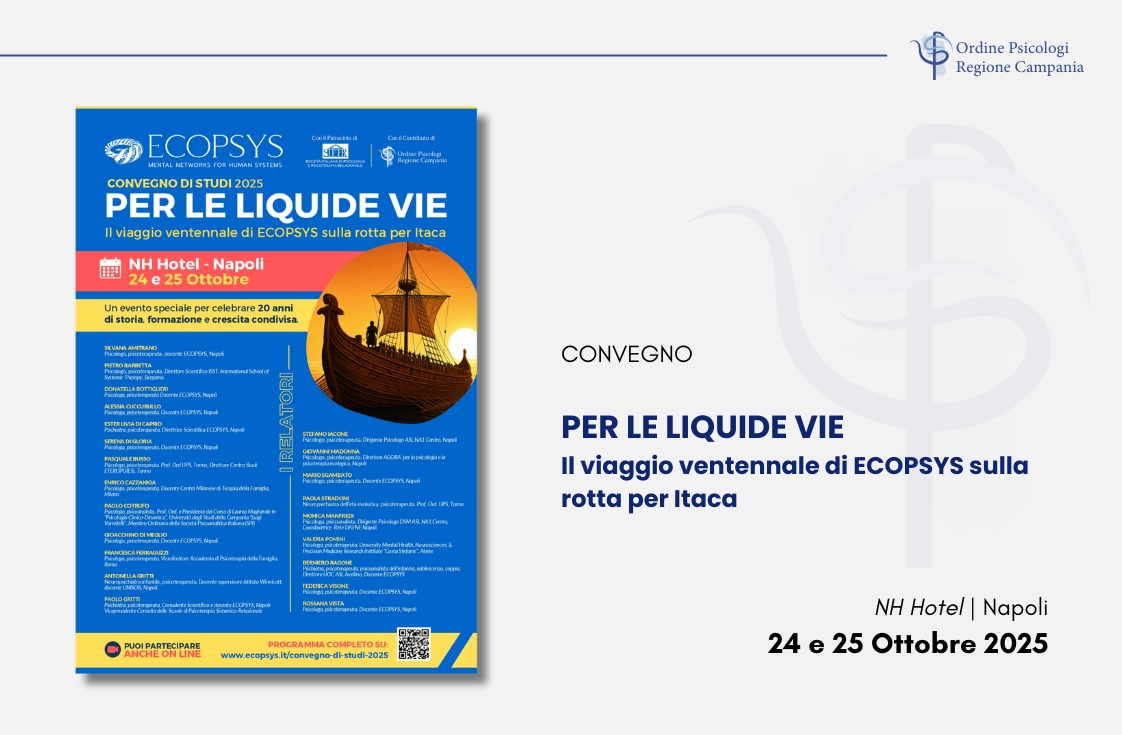 Il prossimo 24 e 25 ottobre 2025, presso NH Hotel di Napoli, si terrà il Convegno di Studi: “Per le vie liquide: il viaggio ventennale di ECOPSYS sulla rotta per Itaca”, patrocinato dall’Ordine degli Psicologi della Regione Campania.