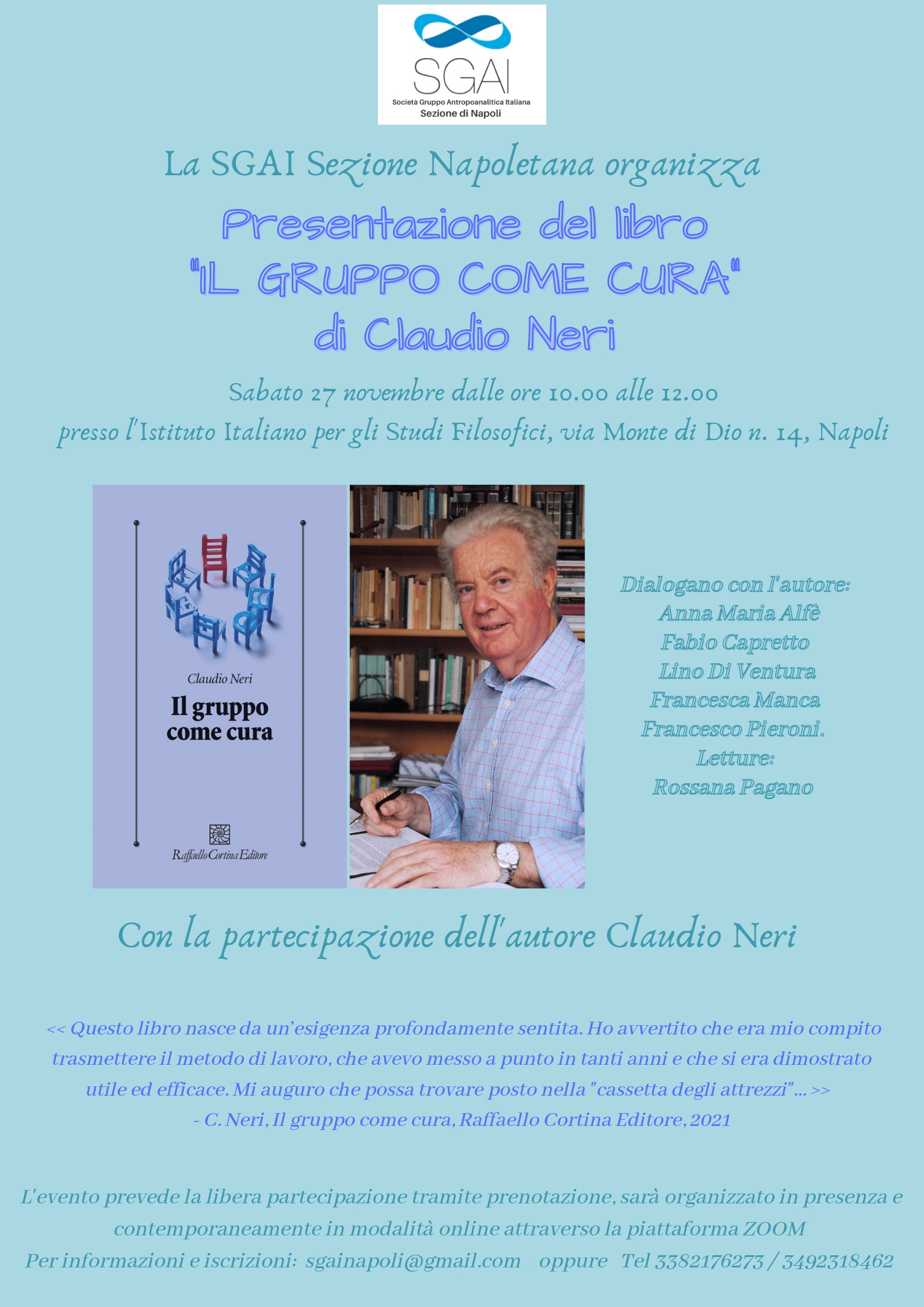 Per chi si trova fuori regione Campania sarà possibile partecipare in modalità online, attraverso la piattaforma ZOOM . La partecipazione è libera, ma è necessario comunicare la propria adesione inviando una email a sgainapoli@gmail.com