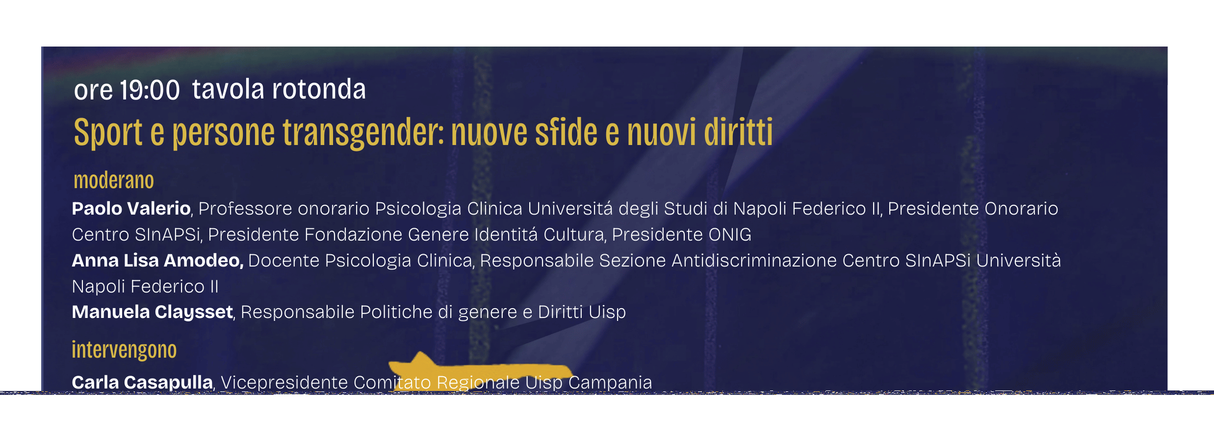 Intervengono: Carla Casapulla, Vicepresidente Comitato Regionale Uisp Campania, Antonello Sannino, Presidente Antinoo Arcigay Napoli, direttivo Pochos Napoli, Luca de Rose, Responsabile Nazionale preparazione mentale squadra olimpica Italiana (sezione femminile) Olimpiadi di Tokyo e Pechino e Francesco Garzillo, Psicologo, Psicoterapeuta, Componente Comitato Pari Opportunità e Cura delle Relazioni OPRC