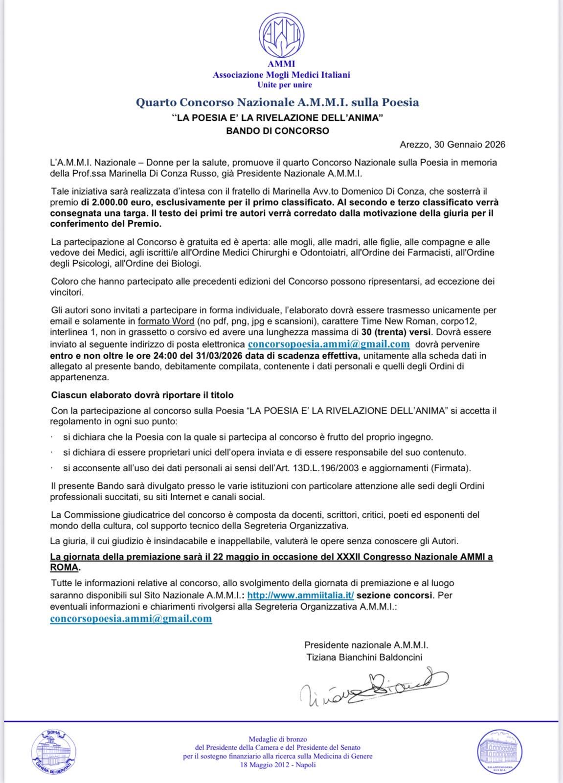 La cerimonia di premiazione si terrà il 22 maggio 2026 a Roma, in occasione del XXXII Congresso Nazionale AMMI.