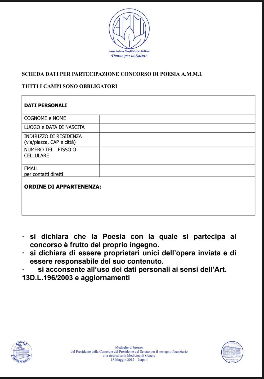 La partecipazione è gratuita. La domanda, corredata dalla scheda dati debitamente compilata, deve essere inviata esclusivamente via email all’indirizzo: concorsopoesia.ammi@gmail.com.