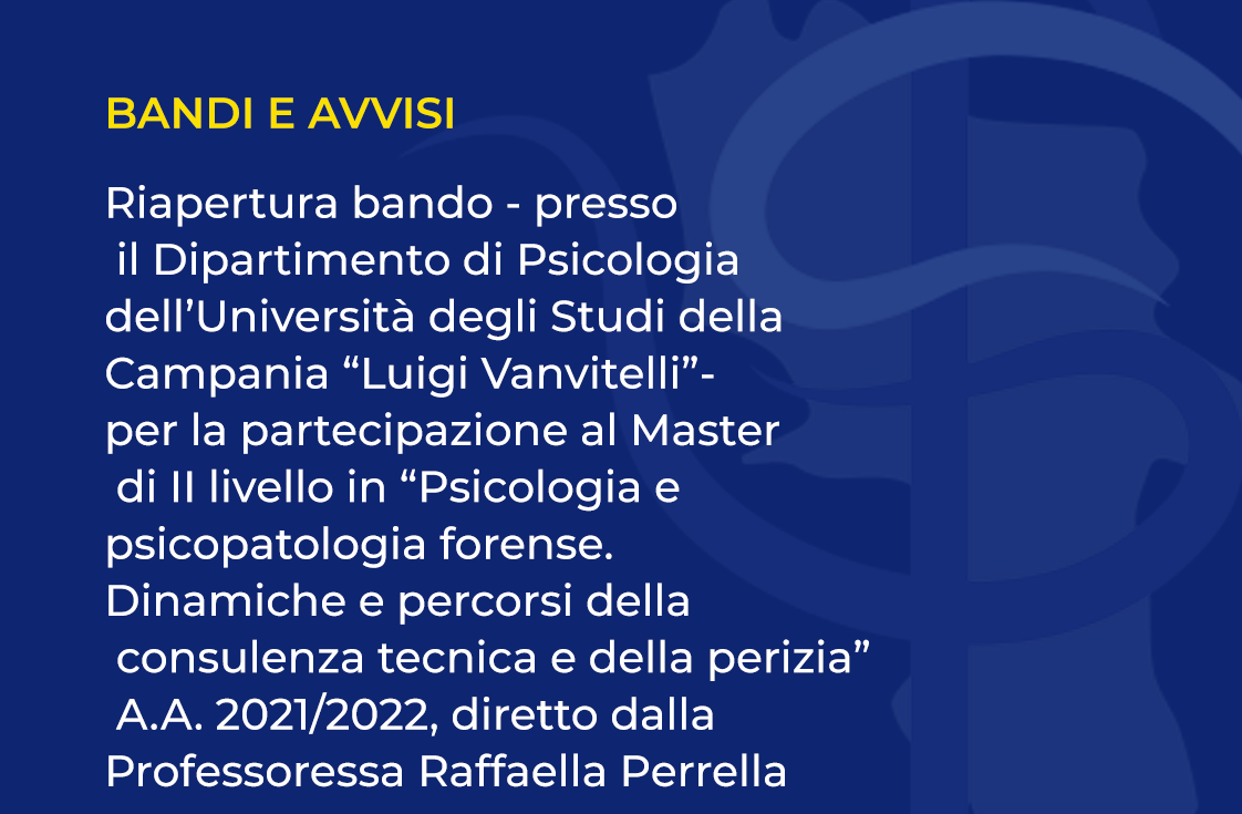 presso il Dipartimento di Psicologia dell’Università degli Studi della Campania “Luigi Vanvitelli”- per la partecipazione al Master di II livello in “Psicologia e psicopatologia forense. Dinamiche e percorsi della consulenza tecnica e della perizia” – A.A. 2021/2022, diretto dalla Professoressa Raffaella Perrella.