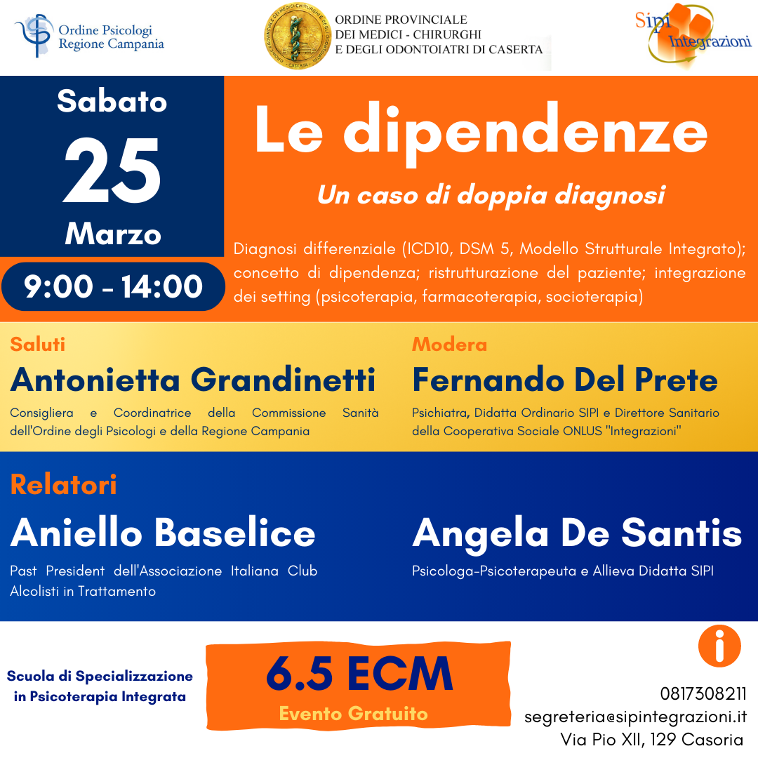 SIPI – SOCIETÀ ITALIANA DI PSICOTERAPIA INTEGRATA. Seminario: Le dipendenze – Un caso di doppia diagnosi: Diagnosi differenziale (ICD10, DSM 5, Modello Strutturale Integrato); concetto di dipendenza; ristrutturazione del paziente; integrazione dei setting (psicoterapia, farmacoterapia, socioterapia)