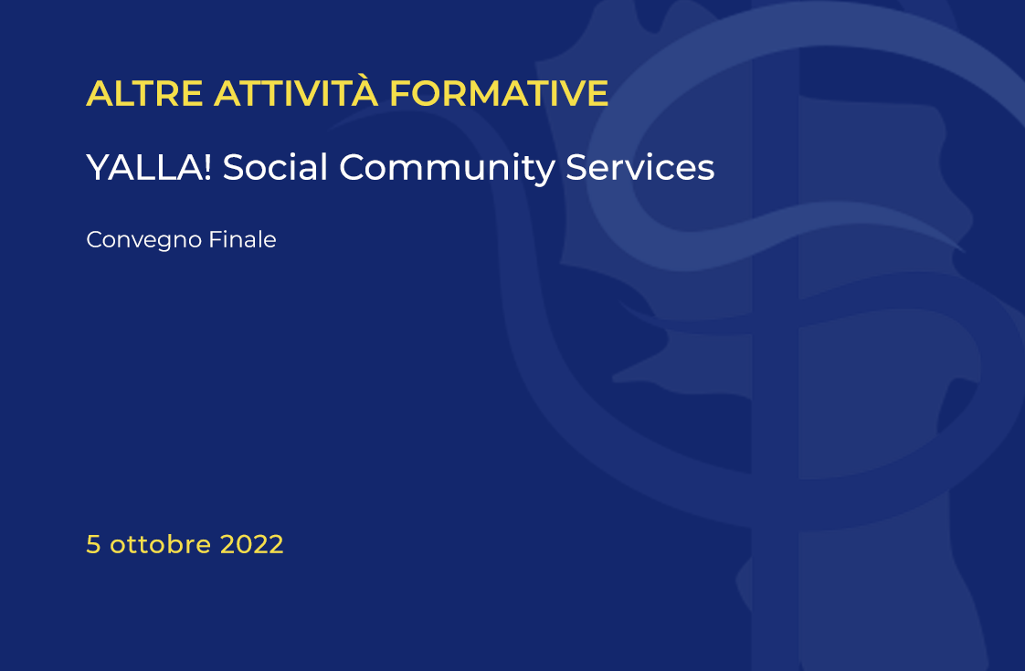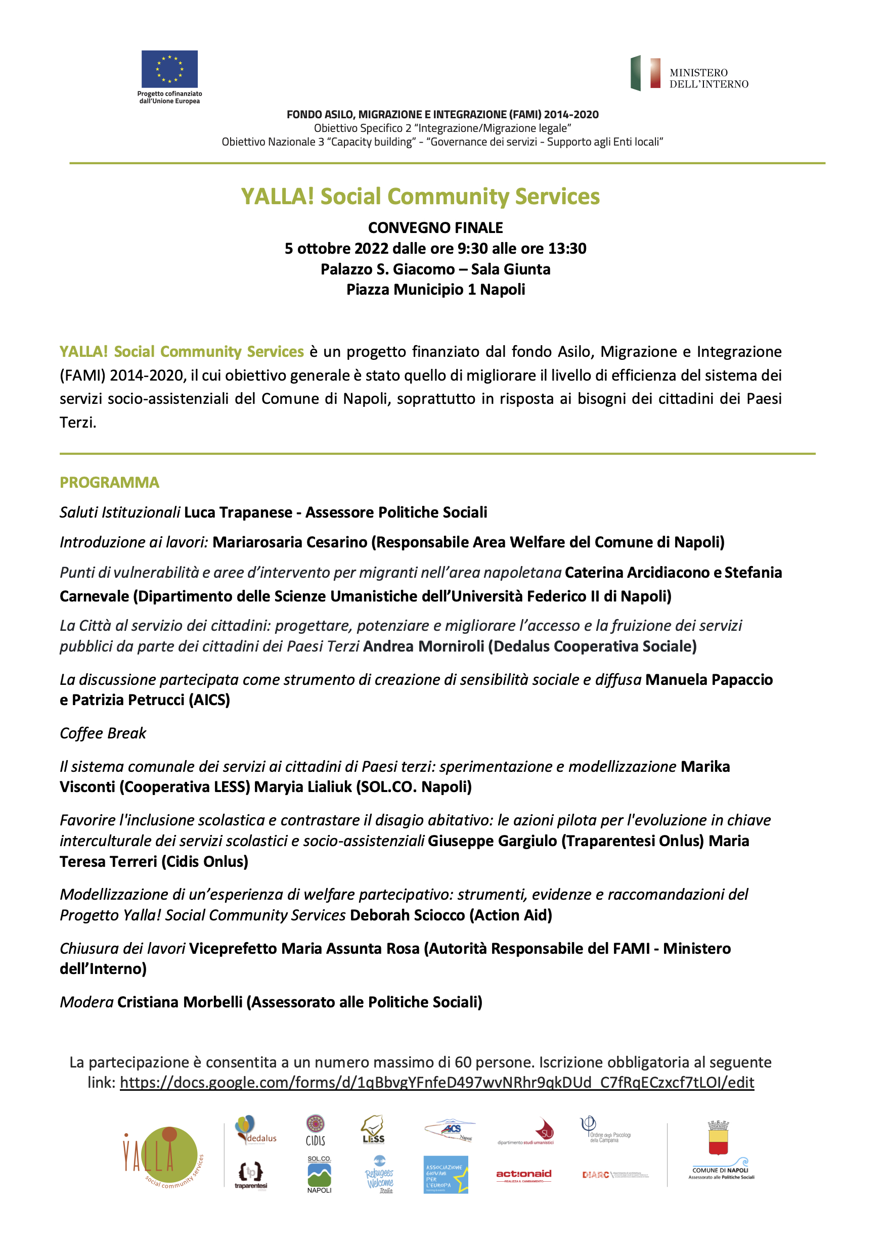YALLA! Social Community Services è un progetto finanziato dal fondo Asilo, Migrazione e Integrazione (FAMI) 2014 2020, il cui obiettivo generale è stato quello di migliorare il livello di efficienza del sistema dei servizi socio-assistenziali del Comune di Napoli, soprattutto nella risposta ai bisogni dei cittadini dei Paesi Terzi. Nello specifico, ha inteso: