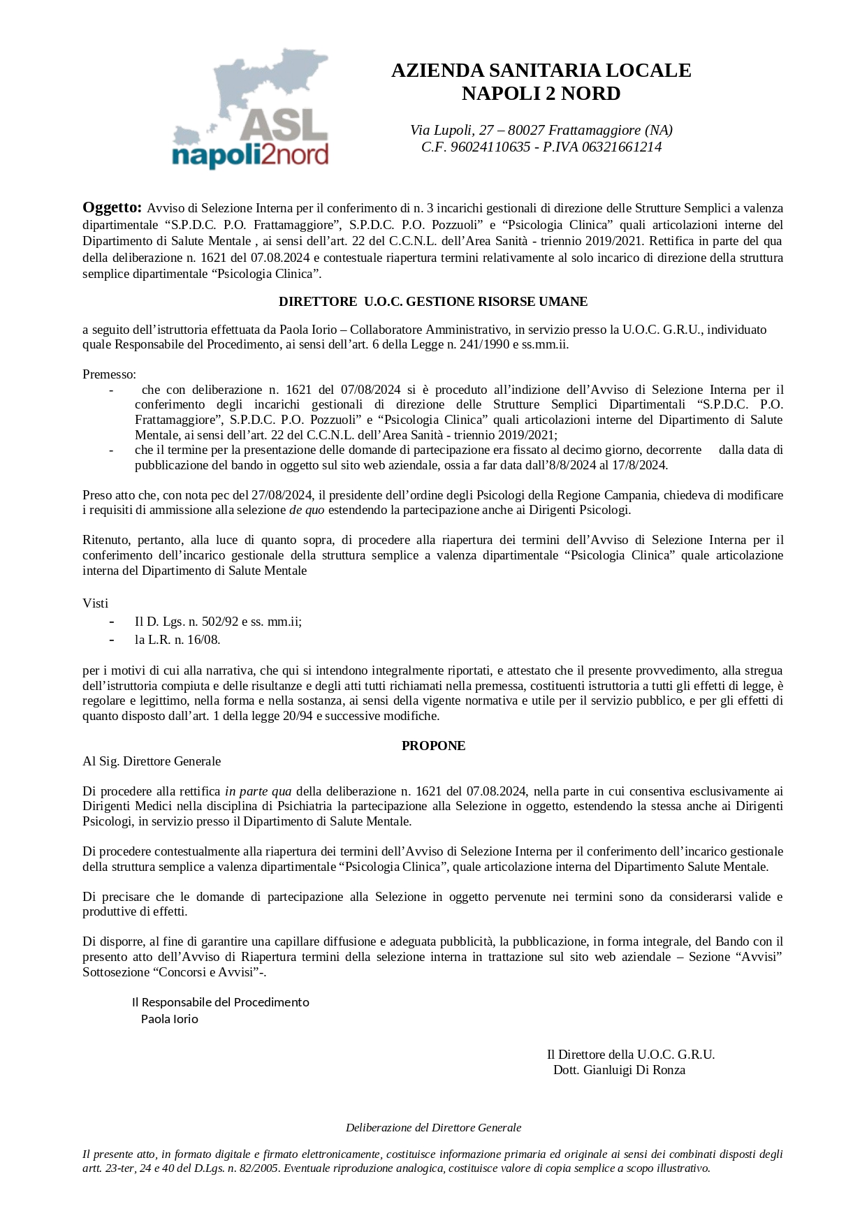 ASL Napoli 2 Nord – Rettifica avviso pubblico per il conferimento dell’incarico di Direttore della U.O.S.D. “Psicologia Clinica” pubblicato con Delibera n.1621 del 07/08/2024