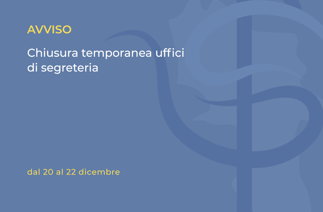 A causa di un aggiornamento dei sistemi di gestione e controllo e contestuale manutenzione straordinaria della sede, gli uffici di segreteria resteranno chiusi da lunedì 20 a mercoledì 22 dicembre.