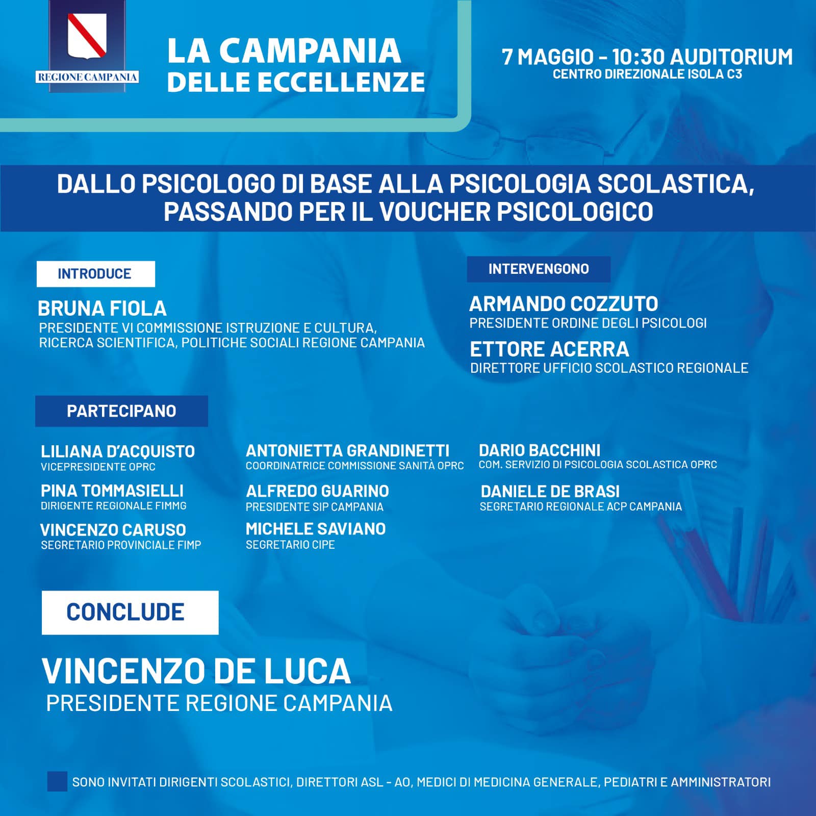 Martedì 7 Maggio presso l’Auditorium del Centro Direzionale – Isola C3, inizio ore 10:30, discuteremo di salute, benessere psicofisico e di tutte le misure che la Regione Campania insieme con il nostro Ordine professionale ha saputo mettere in campo per migliorare la qualità di vita degli studenti, delle loro famiglie e dei cittadini.