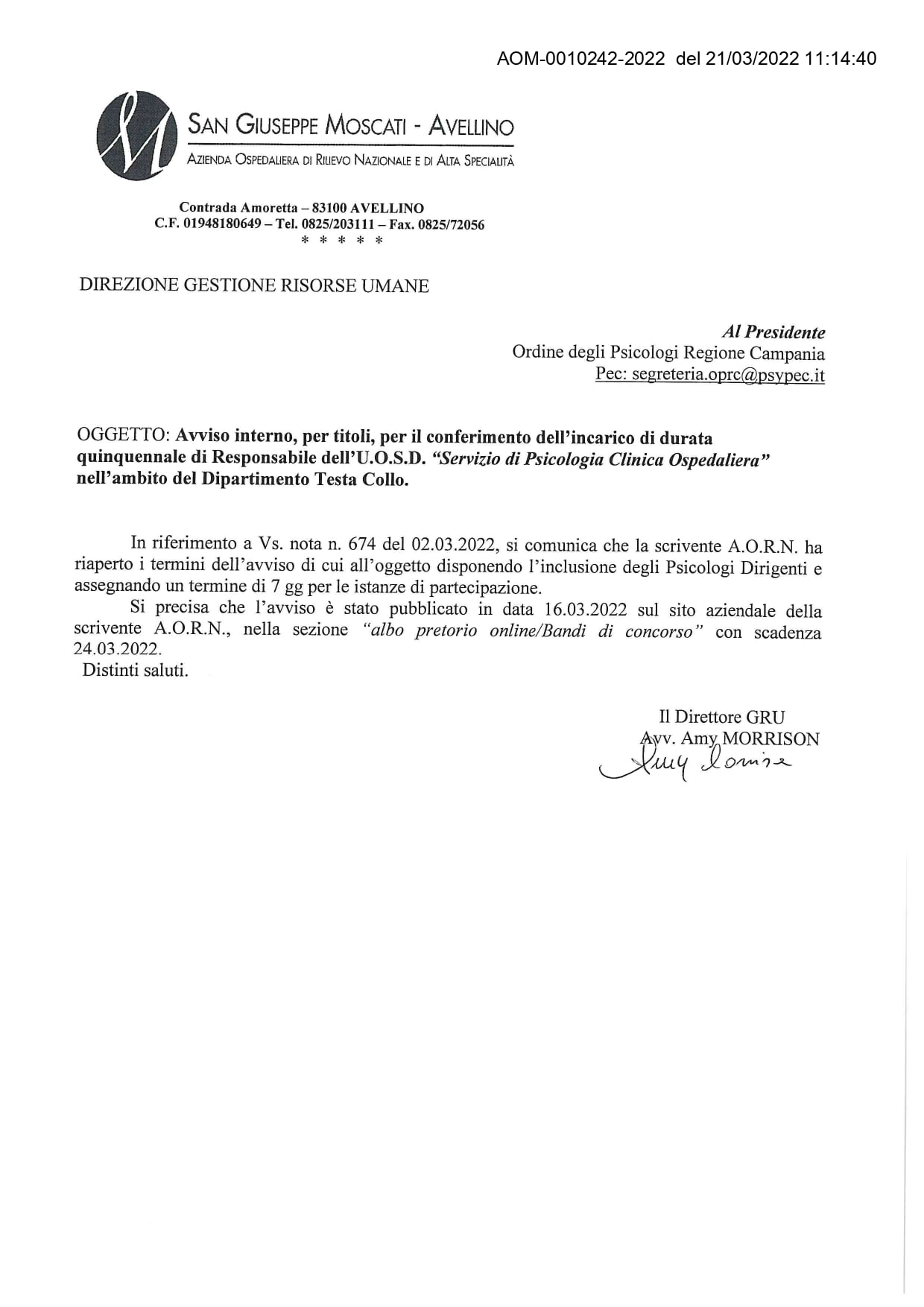 Lo scorso 2 marzo, in seguito alla segnalazione pervenuta al nostro Ordine per il tramite dell’Ordine Psicologi Lazio – acquisita con prot. n. 513/2022 e presa in carico dalla nostra Commissione Tutela con Fascicolo Cod. 9/2022 – abbiamo inviato all’A.O.R.N. San Giuseppe Moscati di Avellino istanza-diffida di sospensione e di rettifica in merito all’ ***Avviso interno per titoli, per il conferimento dell’incarico di durata quinquennale di Responsabile della U.O.S.D. “Servizio di Psicologia Clinica Ospedaliera” nell’ambito del Dipartimento Testa Collo***, pubblicato sull’Albo pretorio online in data 15/02/2022.