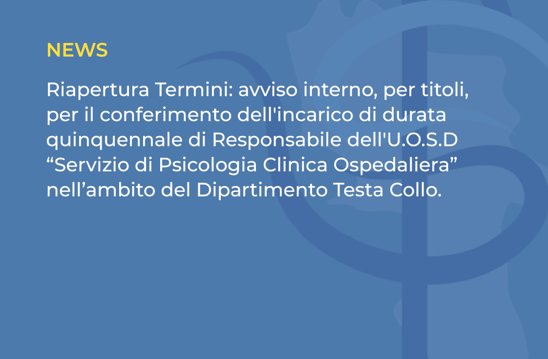 Riapertura Termini: avviso interno, per titoli, per il conferimento dell’incarico di durata quinquennale di Responsabile dell’U.O.S.D