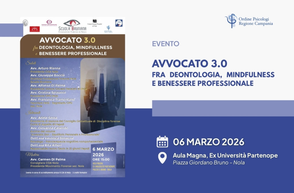 L’Ordine degli Psicologi della Regione Campania patrocina il convegno “Avvocato 3.0 fra Deontologia, Mindfulness e Benessere…